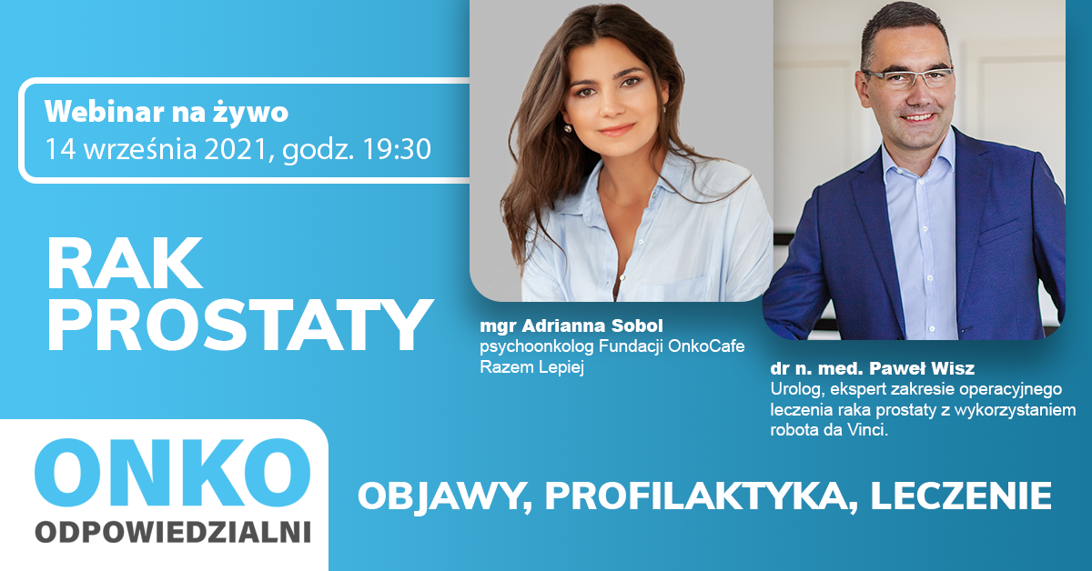 - Spotkania live, z których pierwsze odbędzie się już 14 września o godz. 19.30. W spotkaniu na żywo udział wezmą dr n. med. Paweł Wisz – urolog specjalizujący się w operacyjnym leczeniu raka prostaty z wykorzystaniem robota da Vinci oraz mgr Adrianna Sobol – psychoonkolog z Fundacji OnkoCafe – Razem Lepiej. W trakcie spotkania zostaną poruszone następujące zagadnienia: